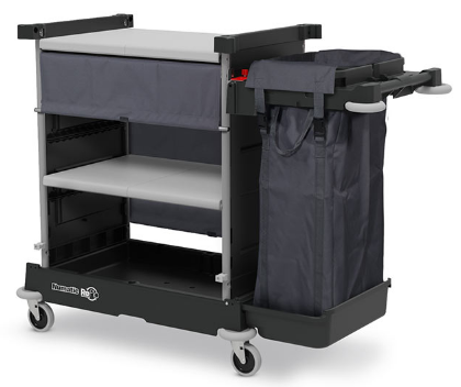 Ce chariot hôtelier est équipé d'une large étagère double et d'un support sac à linge 100L gris.