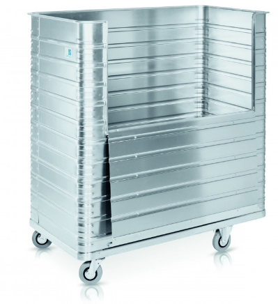 Ce conteneur à déchets en aluminium est une solution de transport robuste avec accès ergonomique aux marchandises par un grand volet.