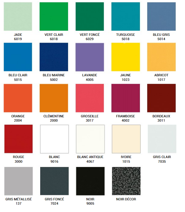 Finition poudre époxy cuite au four (coloris à préciser lors de la commande)