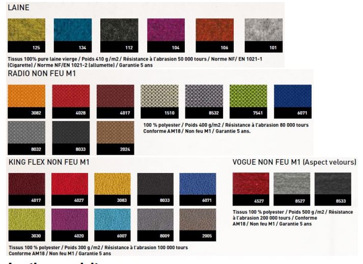 - Coque en multiplis de hêtre qualité A/A, conforme à la norme non feu.