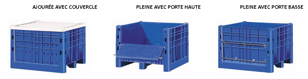 Caisses palettes en PEHD, disponibles en version Pleine ou ajourée, avec ou sans couvercle et roulettes.