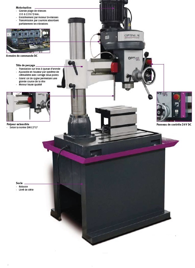 La perceuse radiale optimum exécute en fonte massive et perce avec précision le métal et les pièces importantes.