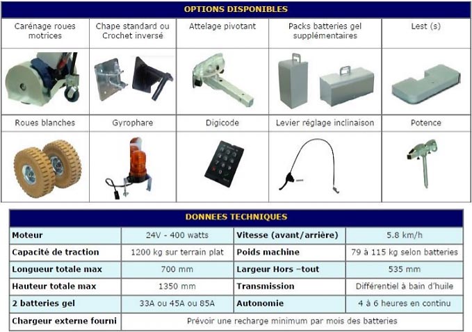 Ses deux batteries 33 A et son moteur à différentiel 400W lui permettent de déplacer jusqu’à 1200 kg sur plat. En cas d'utilisation intensive, une manipulation très simple permet le remplacement du jeu de batteries dont la charge n'est plus suffisante, par un jeu chargé.