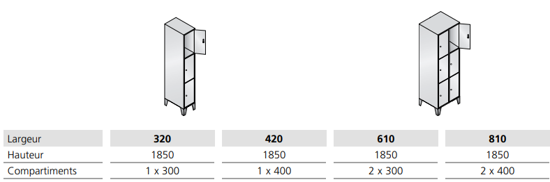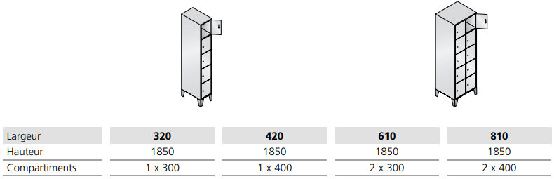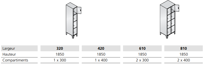 - Dimensions utiles par casier : 295 x 230/330 x 465 mm (H x L x P)