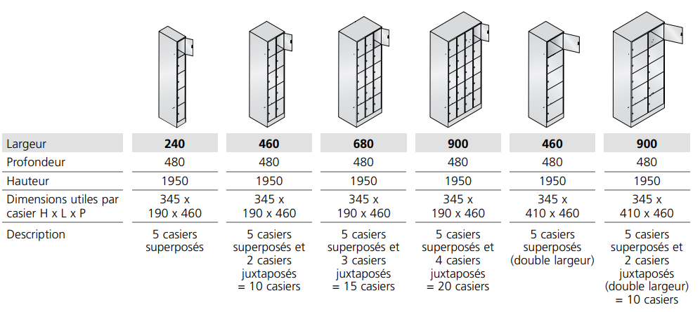 Dimensions utiles par casier (H x L x P) mm :345 x 190 x 460