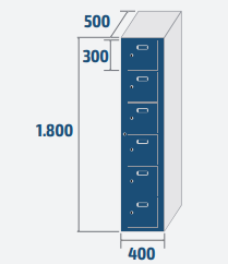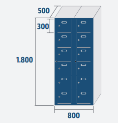 6, 12 ou 18 casiers Largeur : 400, 800 ou 1200 mm Hauteur : 1800 mm Profondeur : 500 mm Serrure standard