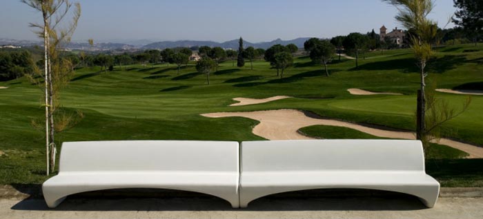 L'inclinaison du siège canalise l'eau vers les côtés, ce qui facilite l'entretien et la conservation du banc.
