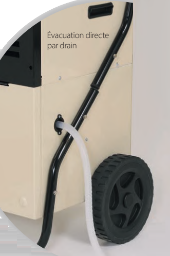 L’humidité ainsi condensée sous forme d’eau est récupérée dans un réservoir de stockage intégré ou évacuée directement à l’extérieur de l’appareil par un tuyau de vidange.