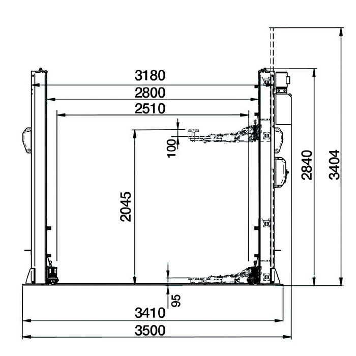 C'est un pont actionné par un circuit hydraulique, avec réalignement des deux chariots, par filins métalliques qui garantissent une excellente synchronisation des chariots, indépendamment de la charge soulevée.