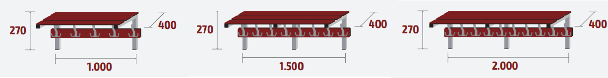 Etagères pour vestiaire avec patère, différentes longueurs : - 1000 mm - 1200 mm - 1500 mm - 1800 mm (tolérance de +/- 50 mm pour chaque) Merci d"avance