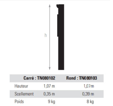- Scellement 0,35 m (carré), 0,39 m (rond)