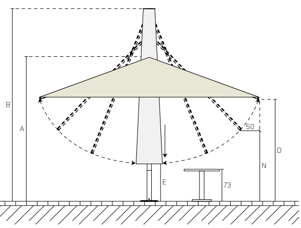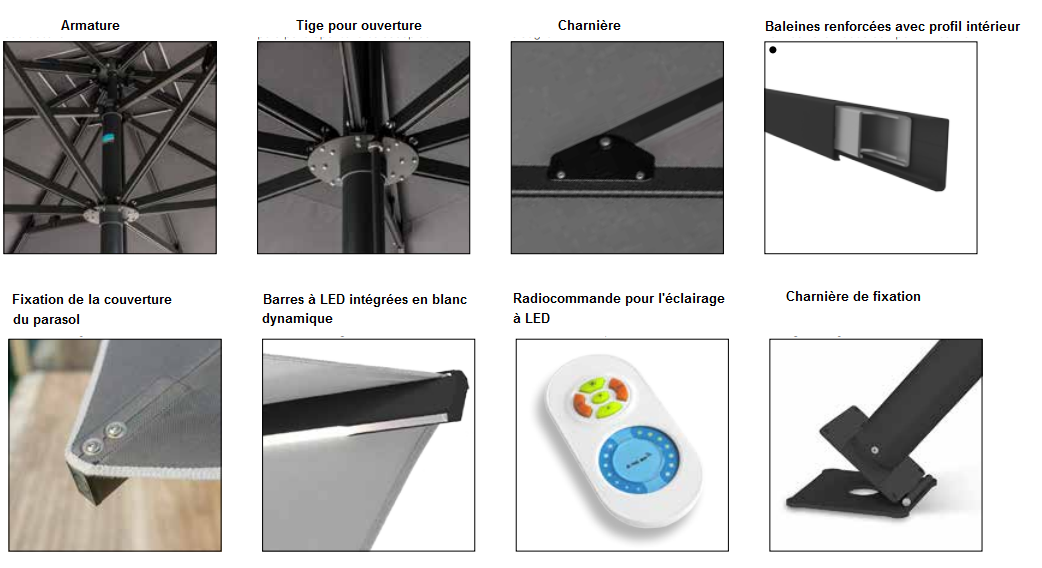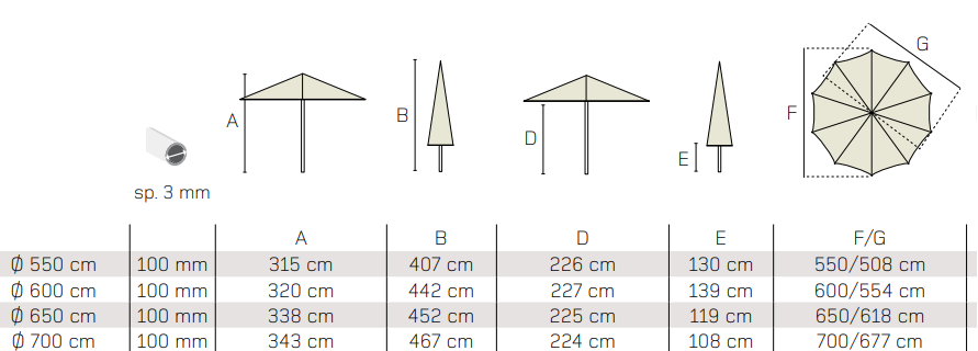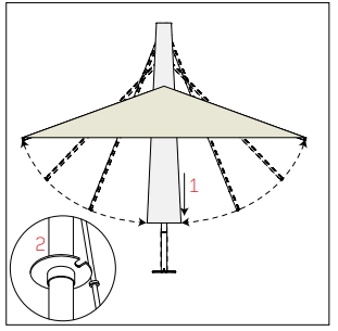 Parasol géant télescopique choisi par le secteur CHR qui recherche une grande couverture, solidité, fiabilité, fonctionnalité.