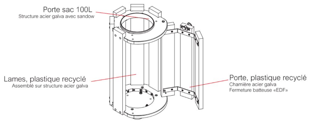 Corbeille d'extérieur réalisée exclusivement en matériau recyclé.