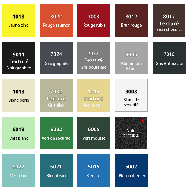 *Teinte NOIR DECOR et autres teintes hors nuancier disponible uniquement sur devis.