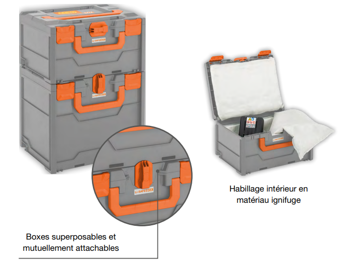 Transport et stockage en toute sécurité des batteries au lithium jusqu'à max. 5 kg.