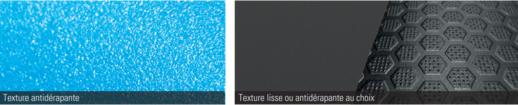 La texture est au choix : lisse ou antidérapante. Les types de sol autorisés sont : gazon, copeaux de bois et sol souple.