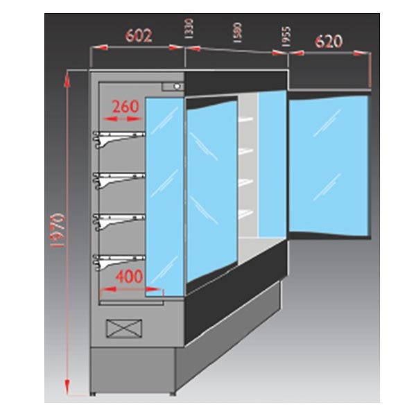 Grâce à ses portes pivotantes, cette vitrine est idéale pour le libre service dans les supermarchés et les espaces d’expositions de produits frais.