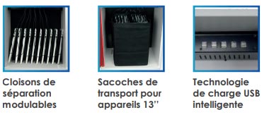 - Capacité : 10 tablettes ou pc 2en1 jusqu'à 14"