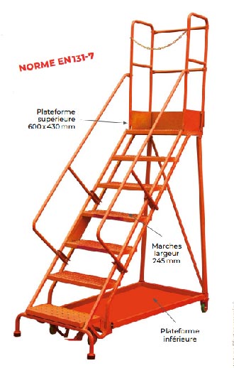 Ses échelons antidérapants sont renforcés par 2 rampes latérales de sécurité, un garde-corps, une main courante ainsi qu’une sous lisse à mi-hauteur.