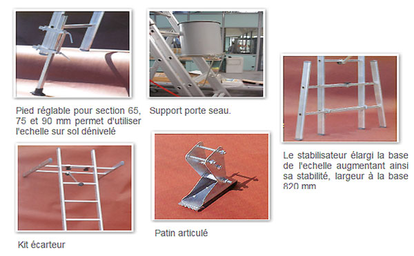 - Pied réglable pour section 65, 75 et 90 mm permet d'utiliser l'échelle sur sol dénivelé