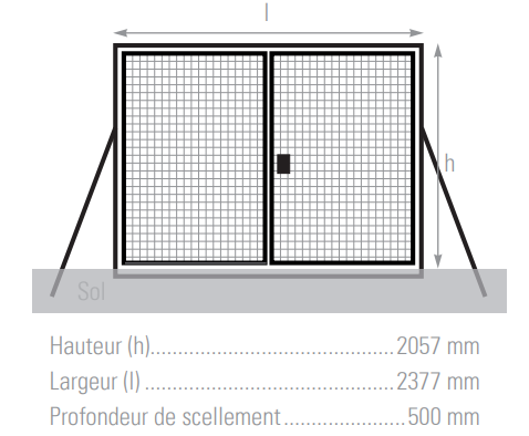 - Modèle 2 portes : tube rond Ø 60 mm et 2 barres d’écartement Ø 50 mm en partie haute et basse, en acier galvanisé plastifié