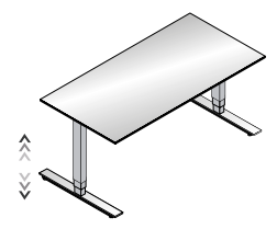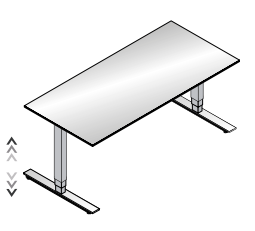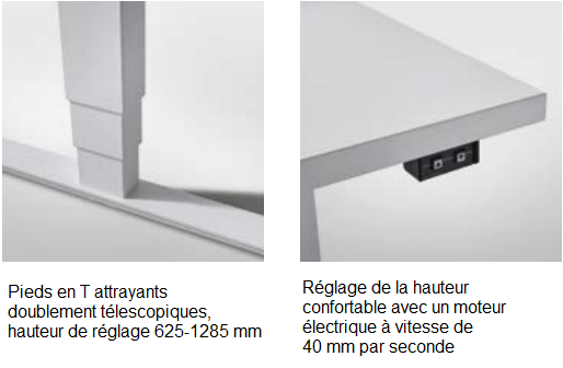 - Piètement en T en tube carré solide en acier, moteur électrique pour le réglage de la hauteur (40 mm par seconde), à protection anti-surchage