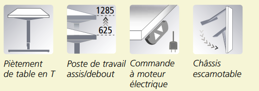 - Doublement télescopique pour une hauteur assis / debout entre 625 et 1285 mm, réglage de niveau supplémentaire sur les pieds en T