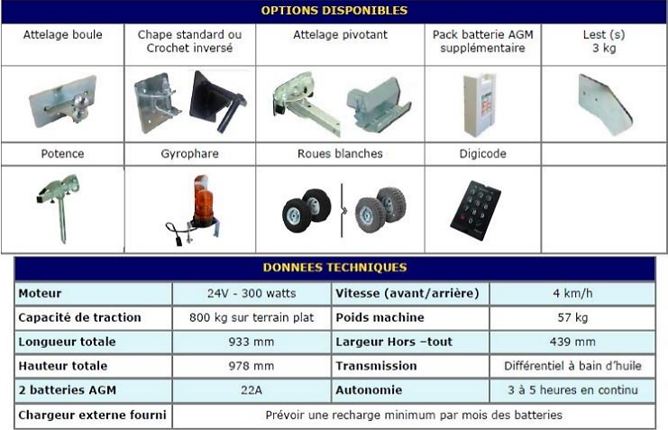 Capacité de traction jusqu'à 800 kg sur plat. Il est équipé de 2 batteries 22A AGM (sans entretien), placées dans un caisson le long du timon. Lors d’une utilisation intensive, il est très facile d’interchanger les jeux de batteries pour prolonger son utilisation, l’opération ne prends qu’une minute.