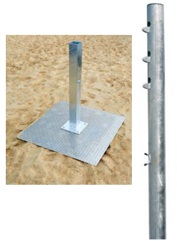 - Livrés avec fourreaux profondeur 1,00 m avec embase en tole ALUMINIUM de retenue du sable.