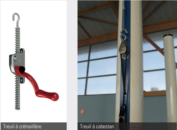 Le système de tension extérieure du filet se fait par treuil à crémaillère et cabestan.