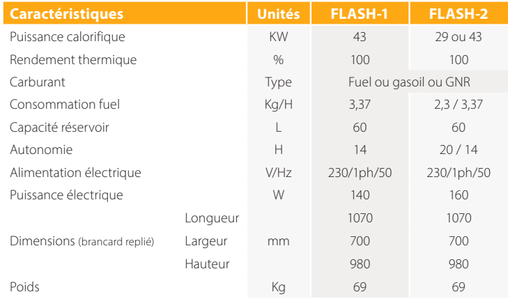 Les FLASH peuvent fonctionner au fuel ou au gasoil. Ils délivrent une puissance maximum de 43 KW et sont disponibles en 2 versions :