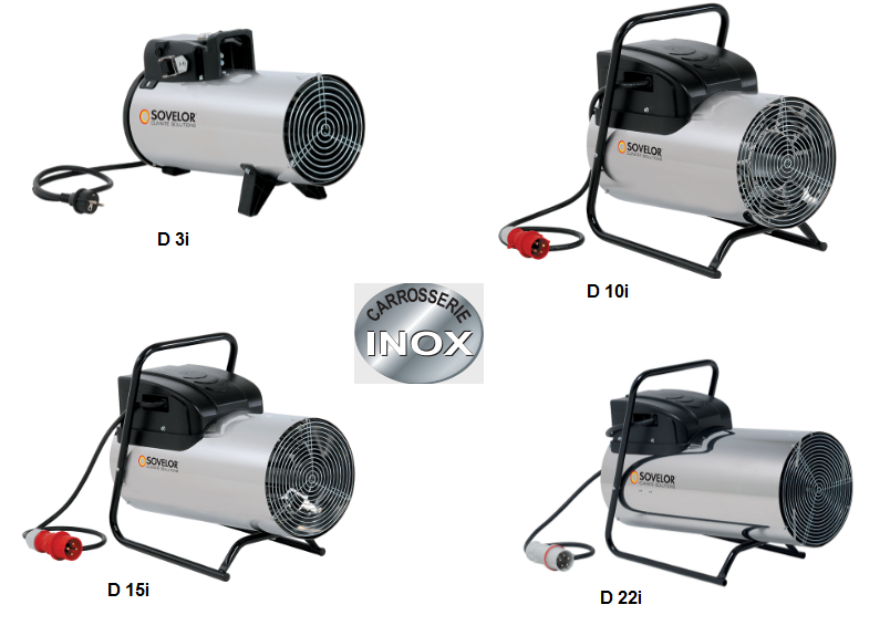Ils se caractérisent par leur carrosserie en acier inoxydable poli, leur prise de raccordement rapide pour commande à distance (thermostat d’ambiance, régulation, horloge…) et leur élévation de température du flux d’air élevée : de 44 à 56°C suivant modèle.