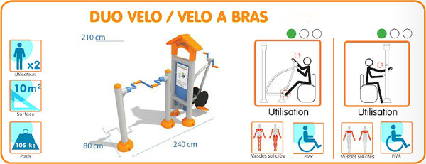 - Vélo à bras : Renforcement des muscles de la partie supérieur du corps (bras, épaules, pectoraux et dorsaux) et des articulations. Améliore la flexibilité et développe les capacités cardio-pulmonaires.