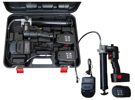 Cette pompe de graissage électrique autonome est fournie avec 2 batteries 24V/2Ah et son chargeur pour prise secteur.