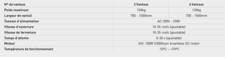 - Bornes de raccordement pour le verrouillage électrique, les contrôles d’accès, le sélecteur de programme, la batterie de secours, les radars, la fonction de verrouillage, etc;