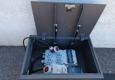 Le coffret encastrable pour distribution électricité est un boîtier pour alimentation électrique d'une robuste structure en acier métallisé et thermolaqué conçu pour des environnements très divers, qu'il s'agisse de places publiques de collectivité ou commune, marché, fêtes foraines mais aussi pour l'industrie.