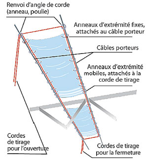 - Il suffit de passer les anneaux sur une tringle ou un câble tendu pour mettre en place les rideaux et doser l’éclairement du local.