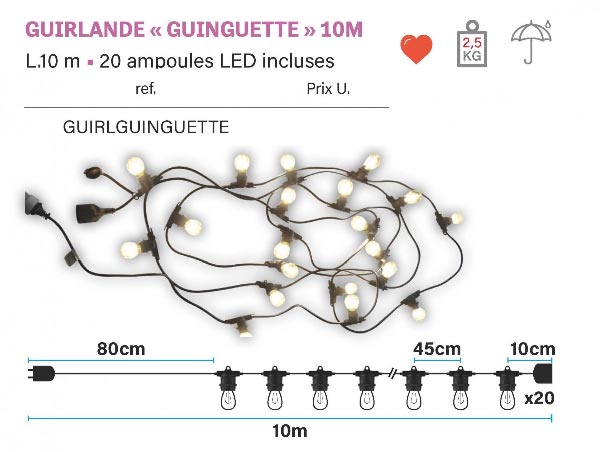 - Equipée de 20 Ampoules LED E27 de 2W, "filaire" fournies
