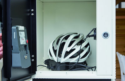 En outre, elle fait office à la fois de borne de recharge grâce à sa prise intégrée mais aussi de casier de rangement pour les accessoires du cycliste, comme le casque de protection ou la sac à dos.