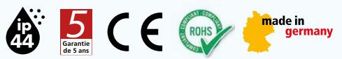 - Bâti d’armoire et composants électriques protégés contre les projections d’eau – IP44 selon la norme DIN EN 60529